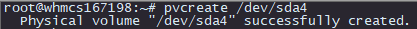 3 - Una vez reiniciado nuestro VPS, procederemos a la creación del volumen físico, mediante el comando "pvcreate /dev/sdaX" (tenemos que cambiar la "X" por el número que nos dió el sistema anteriormente. En el caso del ejemplo, el 4).