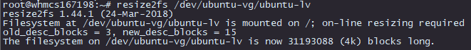 6 - Para finalizar, redimensionamos el Volume Group con el comando "resize2fs /dev/xxxxxx/xxxxxx" en el que nuevamente sustituiremos las primeras "X" por el nombre del volumen, y en las segundas "X" el Logic Volume".