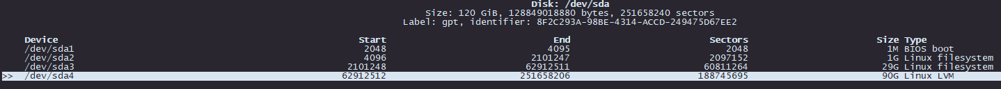 Seleccionaremos el espacio libre, y "NEW". Especificaremos el tamaño, y modificaremos el "TYPE" Linux LVM (8e) de la lista proporcionada. Para finalizar, seleccionaremos "WRITE". Tendremos que anotar el nombre de la nueva partición (sdaX). En el caso del ejemplo, vemos que nos ha dado sda4.