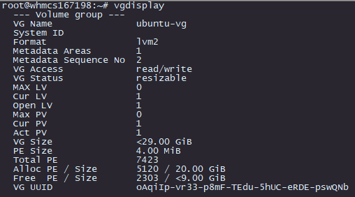 1 - Una vez logeados en el VPS como "root", introduciremos el siguiente comando "vgdisplay", para que nos muestre la información de nuestro volumen de almacenamiento, y anotaremos el nombre del VG Name (en este ejemplo, "ubuntu-vg")
