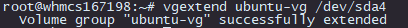 4 - Aquí extenderemos el Volume Group con el volumen físico previamente creado, mediante el comando "vgextend xxxxxxx /dev/sdaX" Importante escribir el nombre del volumen existente, que obtuvimos con el comando "vgdisplay" previamente. También, como en el paso anterior, sustituir la "X" del "sda" por el número que corresponda.